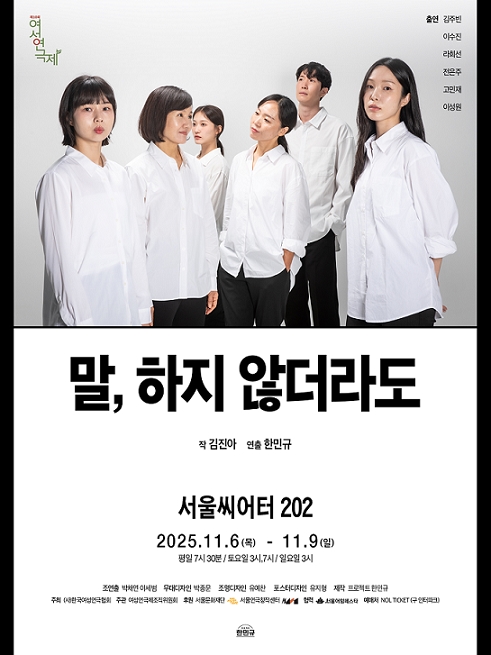 제6회 여성연극제에서 최우수 작가상을 받은 김진아 작가의 희곡 ‘말, 하지 않더라도’가 연극무대에 오른다. 사람과 사람 사이에는, 말보다 깊은 소리가 있다. 김진아 작/연출의 희곡 ‘말,하지 않더라도’는 바로 그 무언의 울림에 귀 기울인다. 이 작품은 침묵 그 자체를 주제