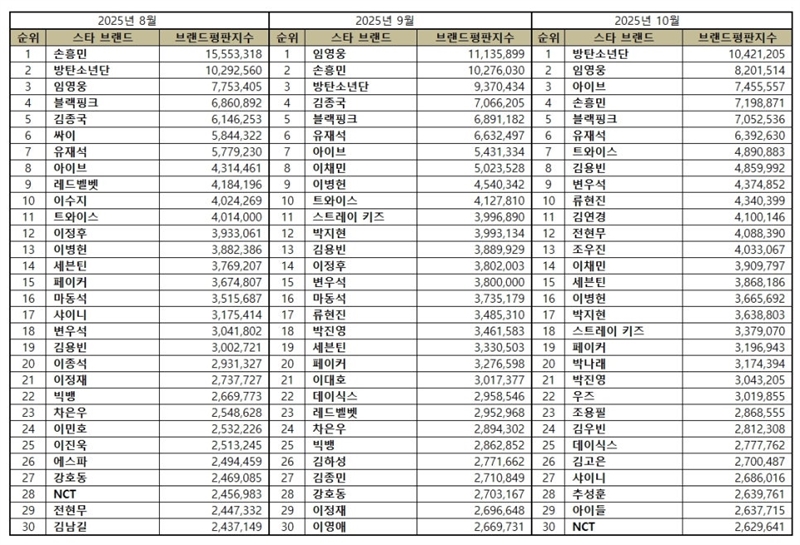 2025년 10월 스타 브랜드평판 30위 순위는 방탄소년단, 임영웅, 아이브, 손흥민, 블랙핑크, 유재석, 트와이스, 김용빈, 변우석, 류현진, 김연경, 전현무, 조우진, 이채민, 세븐틴, 이병헌, 박지현, 스트레이 키즈, 페이커, 박나래, 박진영, 우즈, 조용필, 김우빈, 데이식스, 김고은, 샤이니, 추성훈, 아이들, NCT 순으로 분석됐다.