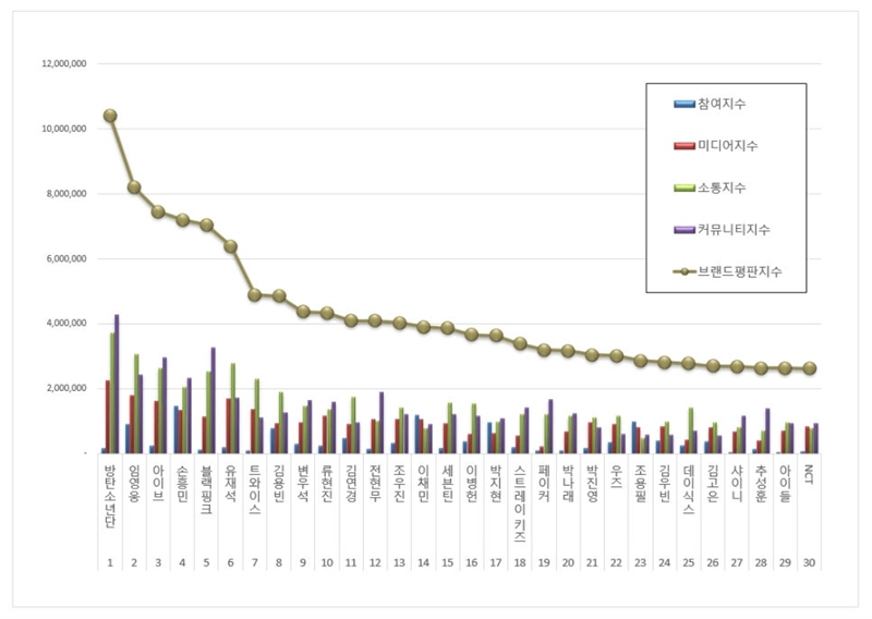 스타 브랜드평판 1위를 기록한 방탄소년단 ( RM, 진, 슈가, 제이홉, 지민, 뷔, 정국 ) 브랜드는 참여지수 167,277 미디어지수 2,259,298 소통지수 3,725,463 커뮤니티지수 4,269,167이 되면서 브랜드평판지수 10,421,205로 분석됐다. 지난 9월 브랜드평판지수 9,370,434와 비교해보면 11.21% 상승했다.