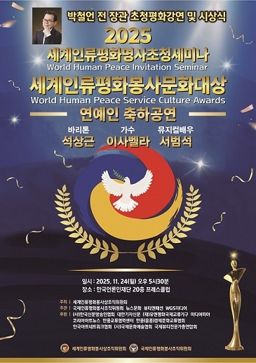 오는 11월 24일(월) 오후 5시 30분 한국프레스센터 20층 프레스클럽에서 개최되는 시인이자 법조인 박철언 전 장관의 ‘2025 세계인류평화명사초청세미나’ 및 ‘2025 세계인류평화봉사문화대상 시상식’에 탤런트 정혜선 씨 등 1차 수상자가 선정되었다.