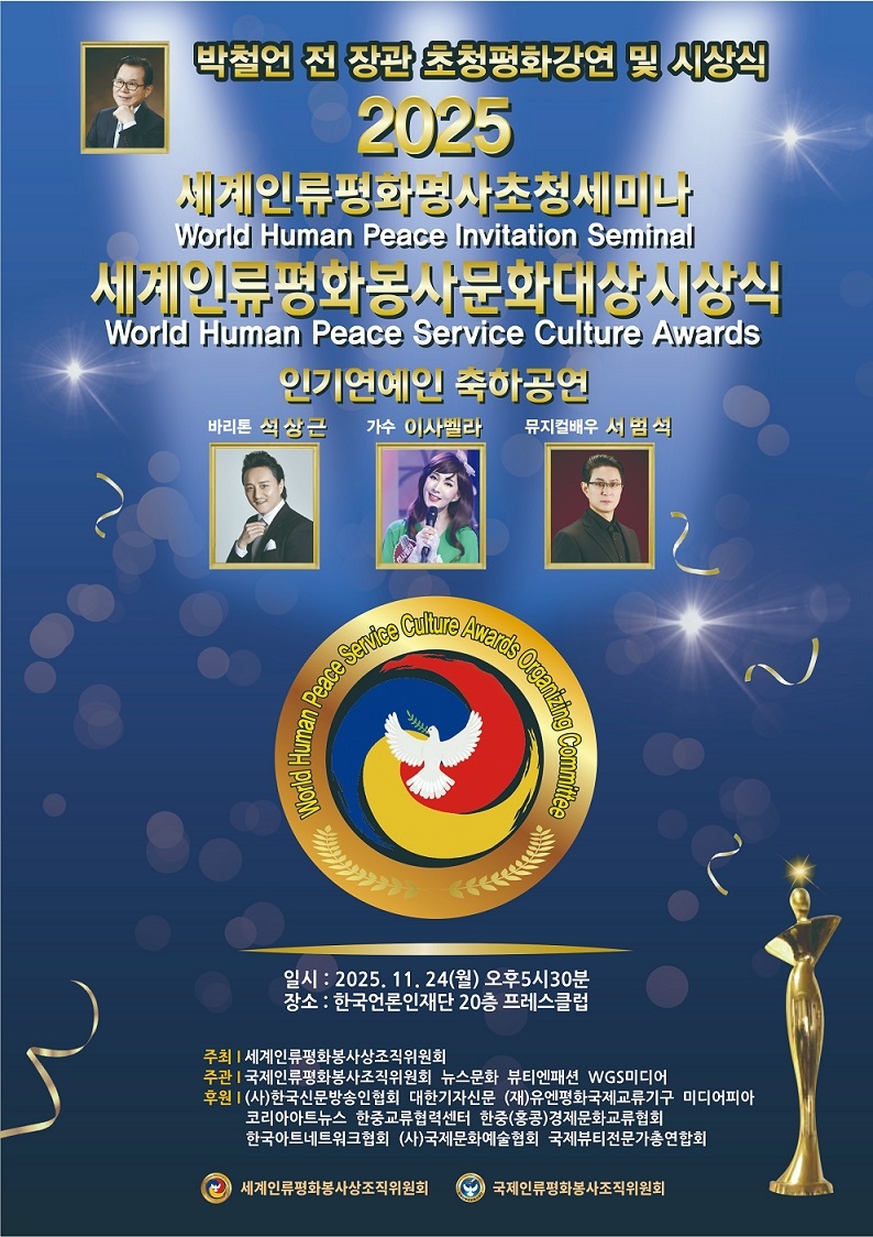 세계인류평화봉사상조직위원회(공동위원장 우덕수·김태후)가 주최한 이번 행사는 사회 각 분야에서 나눔과 봉사를 실천하며 인류 평화와 문화 발전에 기여한 인물을 선정해 시상하는 자리다.