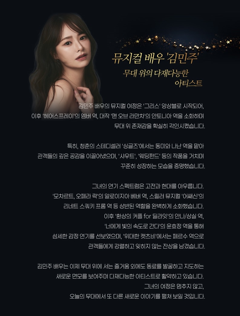 뮤지컬 배우 김민주도 이번 공연에 함께해 무대의 무게감을 더한다. ‘그리스’ 앙상블로 데뷔한 김민주는 ‘헤어스프레이’, ‘맨 오브 라만차’의 안토니아 역 등을 통해 탄탄한 연기력과 가창력을 다져왔다. 또 ‘싱글즈’, ‘모차르트, 오페라 락’, ‘어쌔신’ 등 다양한 작품에서 섬세한 감정 표현으로 관객들에게 강렬한 인상을 남기고 있다.