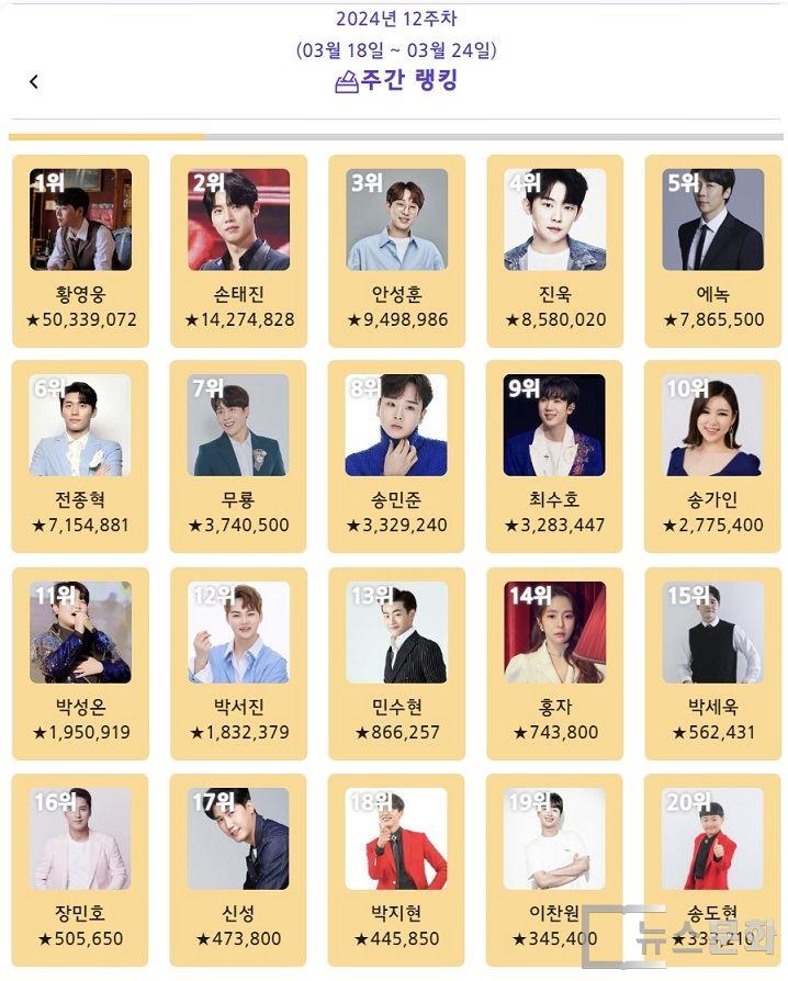트로트 가수 황영웅이 트로트 가수 인기차트 서비스 앱 ‘트롯스타’에서 3월 4주차 1위를 차지하며 가장 많은 별을 받았다. 2024년 3월 4주차 주간랭킹에서는 황영웅이 50,339,072표를 얻으며 1위를 차지했다. 2위는 14,274,828표를 얻은 손태진, 3위는 9,498,986표를 획득한 안성훈, 4위는 8,