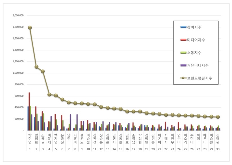 4위, 이문세 브랜드는 참여지수 56,684 미디어지수 161,245 소통지수 156,243 커뮤니티지수 252,470이 되면서 브랜드평판지수 626,643으로 분석됐다. 지난 8월 브랜드평판지수 671,208과 비교해보면 6.64% 하락했다.