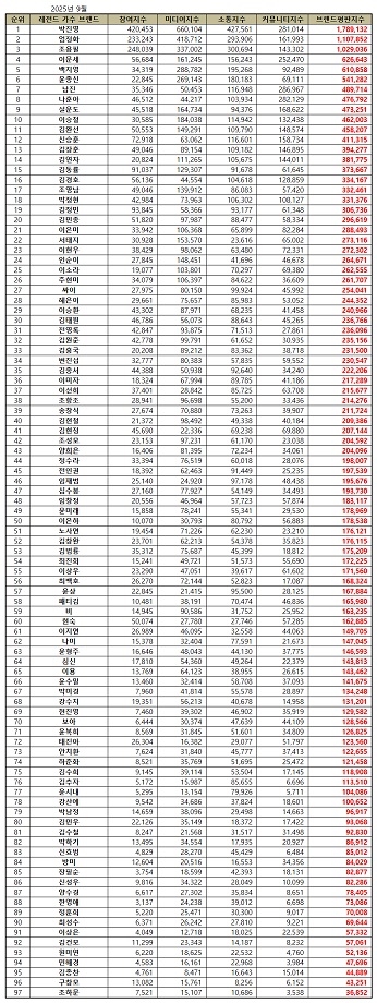 한국기업평판연구소는 2025년 8월 19일부터 2025년 9월 19일까지 측정한 레전드 가수 브랜드 빅데이터 23,352,765개를 소비자 행동분석을 통해 레전드 가수 브랜드에 대한 참여지수, 미디어지수, 소통지수, 커뮤니티지수를 측정했다. 지난 8월 레전드 가수 브랜드 빅데이터 25,066,251개와 비교하면 6.84% 줄어들었다.
