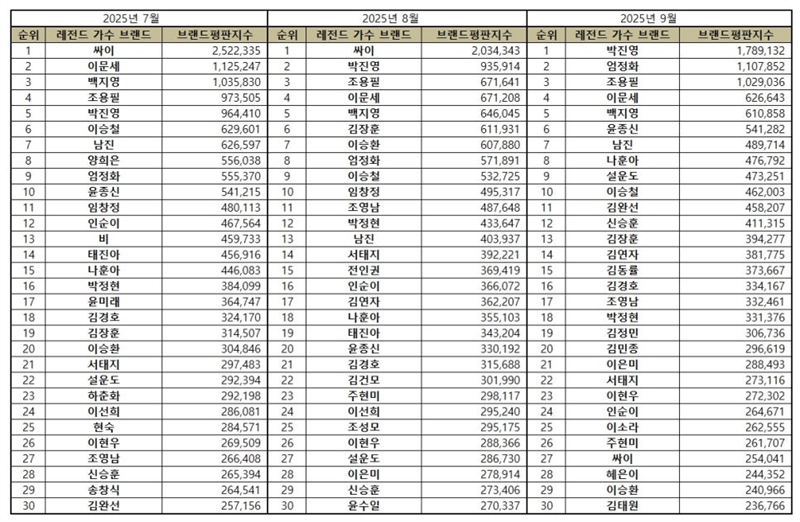 2025년 9월 레전드 가수 브랜드평판 30위 순위는 박진영, 엄정화, 조용필, 이문세, 백지영, 윤종신, 남진, 나훈아, 설운도, 이승철, 김완선, 신승훈, 김장훈, 김연자, 김동률, 김경호, 조영남, 박정현, 김정민, 김민종, 이은미, 서태지, 이현우, 인순이, 이소라, 주현미, 싸이, 혜은이, 이승환, 김태원 순으로 분석됐다.