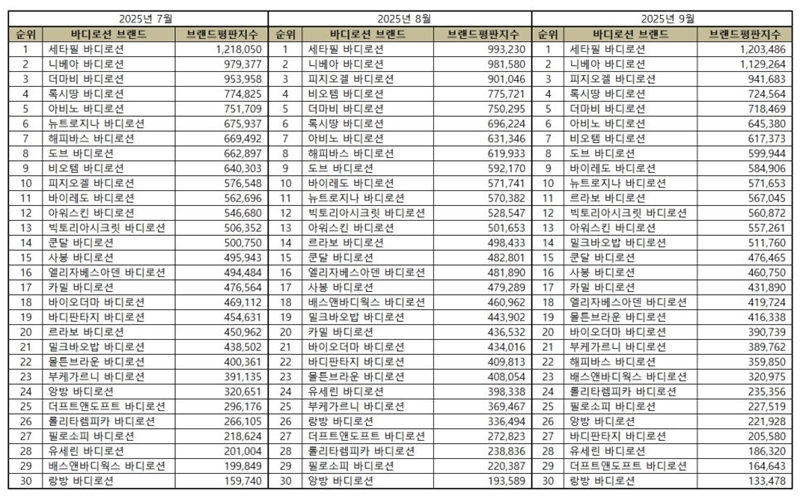 2025년 9월 바디로션 브랜드평판 순위는 세타필, 니베아, 피지오겔, 록시땅, 더마비, 아비노, 비오템, 도브, 바이레도, 뉴트로지나, 르라보, 빅토리아시크릿, 아워스킨, 밀크바오밥, 쿤달, 사봉, 카밀, 엘리자베스아덴, 몰튼브라운, 바이오더마, 부케가르니, 해피바스, 배스앤바디웍스, 롤리타렘피카, 필로소피, 앙방, 바디판타지, 유세린, 더프트앤도프트, 랑방 바디로션 순으로 분석됐다.