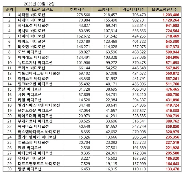 한국기업평판연구소는 소비자들에게 사랑받는 바디로션 브랜드에 대해 브랜드 빅데이터를 통한 평판조사를 했다. 30개 바디로션 브랜드평판 분석은 2025년 8월 12일부터 2025년 9월 12일까지의 바디로션 브랜드 빅데이터 14,974,978개를 분석하여 소비자들의 브랜드 습관과 브랜드와 관계 분석을 통해 브랜드평판을 분석했다. 지난 8월 브랜드 빅데이터 15,679,494개와 비교하면 4.49% 줄어들었다.