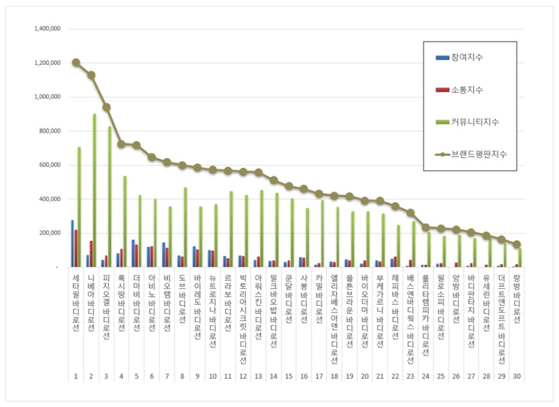 2위, 니베아 바디로션 브랜드는 참여지수 70,984 소통지수 155,498 커뮤니티지수 902,781이 되면서 브랜드평판지수 1,129,264로 분석됐다. 지난 8월 브랜드평판지수 981,580과 비교해보면 15.05% 상승했다.