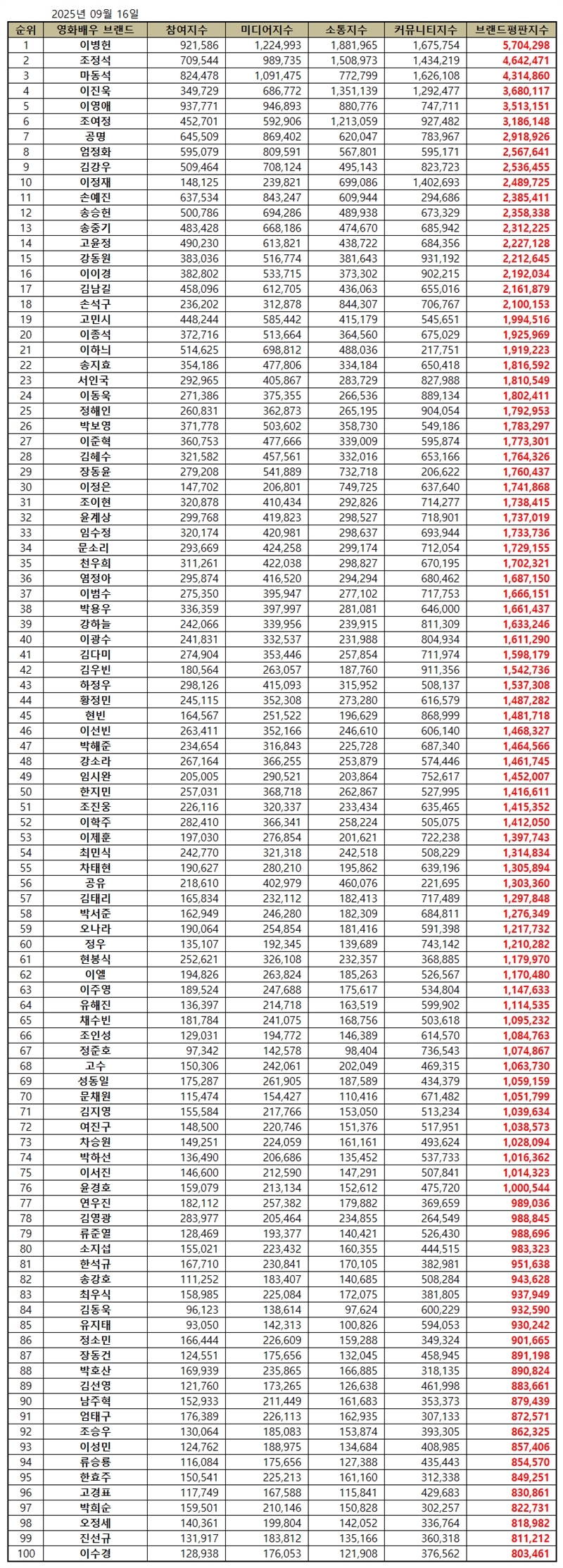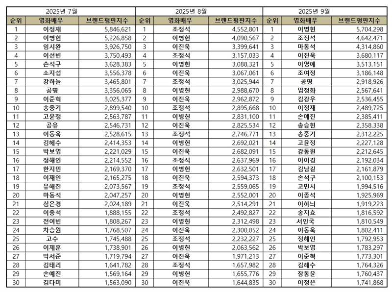2025년 9월 영화배우 브랜드평판 30위 순위는 이병헌, 조정석, 마동석, 이진욱, 이영애, 조여정, 공명, 엄정화, 김강우, 이정재, 손예진, 송승헌, 송중기, 고윤정, 강동원, 이이경, 김남길, 손석구, 고민시, 이종석, 이하늬, 송지효, 서인국 , 이동욱, 정해인, 박보영, 이준혁, 김혜수, 장동윤 , 이정은 순이었다.