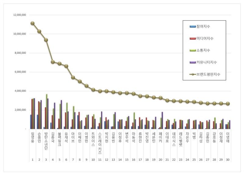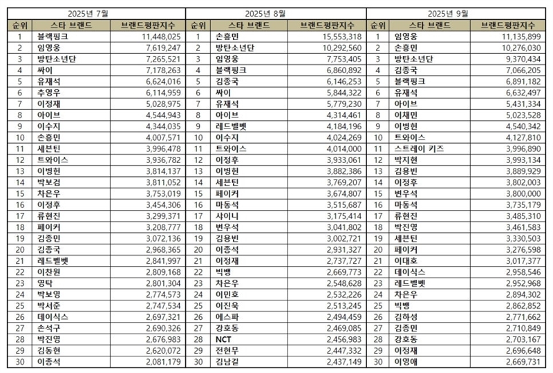 2025년 9월 스타 브랜드평판 30위 순위는 임영웅, 손흥민, 방탄소년단, 김종국, 블랙핑크, 유재석, 아이브, 이채민, 이병헌, 트와이스, 스트레이 키즈, 박지현, 김용빈, 이정후, 변우석, 마동석, 류현진, 박진영, 세븐틴, 페이커, 이대호, 데이식스, 레드벨벳, 차은우, 빅뱅, 김하성, 김종민, 강호동, 이정재, 이영애 순으로 분석됐다.