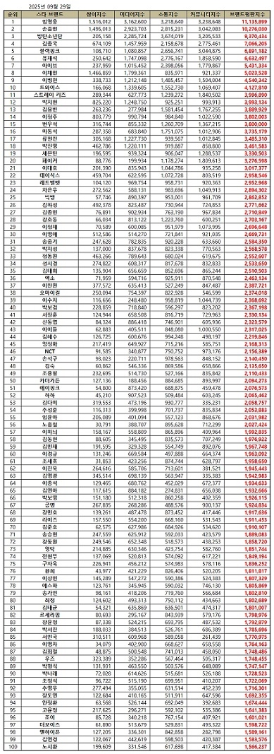 스타 브랜드평판 2025년 9월 빅데이터 분석 100위는 임영웅, 손흥민, 방탄소년단, 김종국, 블랙핑크, 유재석, 아이브, 이채민, 이병헌, 트와이스, 스트레이 키즈, 박지현, 김용빈, 이정후, 변우석, 마동석, 류현진, 박진영, 세븐틴, 페이커, 이대호, 데이식스, 레드벨벳, 차은우, 빅뱅, 김하성, 김종민, 강호동, 이정재, 이영애, 송중기, 박지성, 정동원, 성시경, 김태희, 엑소, 이찬원, 오마이걸, 이수지, 박보검, 서장훈, 신동엽, 아이들, 김혜수, 엄정화, NCT, 손석구, 김숙, 조용필, 카더가든, 에이핑크, 하하, 김다미, 추성훈, 임윤아, 노홍철, 이하늬, 김동현, 김민재, 이경규, 조세호, 이진욱, 김영광, 이종석, 김연아, 박보영, 공명, 강민호, 라이즈, 김준호, 송승헌, 강동원, 영탁, 전현무, 구자욱, 환희, 이상민, 에스파, 송가인, 최정, 김태균, 르세라핌, 장윤정, 박서진, 서인국, 이영자, 김희철, 우즈, 박형식, 박나래, 조정석, 추영우, 장도연, 안정환, 고윤정, 조이, 더보이즈, 엔하이픈, 김연경, 노시환 순으로 분석됐다.