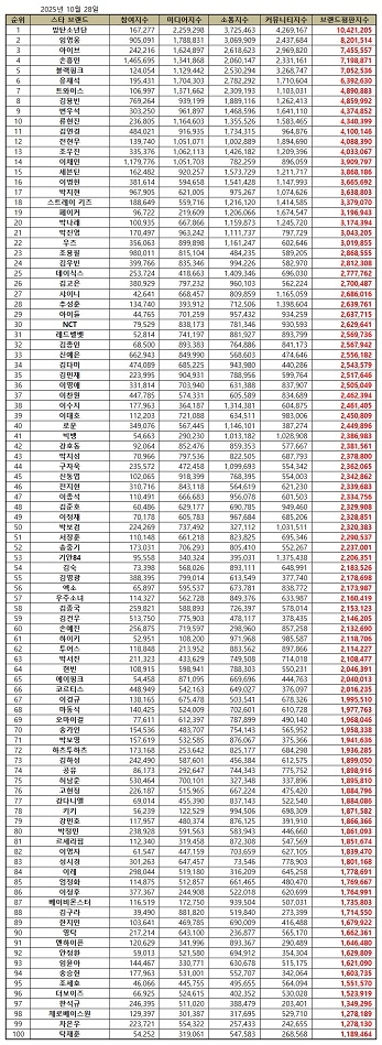 스타 브랜드평판 2025년 10월 빅데이터 분석 100위는 방탄소년단, 임영웅, 아이브, 손흥민, 블랙핑크, 유재석, 트와이스, 김용빈, 변우석, 류현진, 김연경, 전현무, 조우진, 이채민, 세븐틴, 이병헌, 박지현, 스트레이 키즈, 페이커, 박나래, 박진영, 우즈, 조용필, 김우빈, 데이식스, 김고은, 샤이니, 추성훈, 아이들, NCT, 레드벨벳, 김종민, 신예은, 김다미, 김민재, 이영애, 이찬원, 이수지, 이대호, 로운, 빅뱅, 강호동, 박지성, 구자욱, 신동엽, 전지현, 이종석, 김준호, 이정재, 박보검, 서장훈, 송중기, 기안84, 김숙, 김영광, 엑소, 우주소녀, 김종국, 김건우, 손예진, 하이키, 투어스, 박서진, 현빈, 에이핑크, 코르티스, 이경규, 마동석, 오마이걸, 송가인, 박보영, 하츠투하츠, 김하성, 공유, 허남준, 고현정, 강다니엘, 키키, 강민호, 박정민 , 르세라핌, 이영자, 성시경, 이레, 엄정화, 이정후, 베이비몬스터, 김구라, 한지민, 영탁, 엔하이픈, 안정환, 임윤아, 송승헌, 조세호, 더보이즈, 한석규, 제로베이스원, 차은우, 탁재훈 순으로 분석됐다.