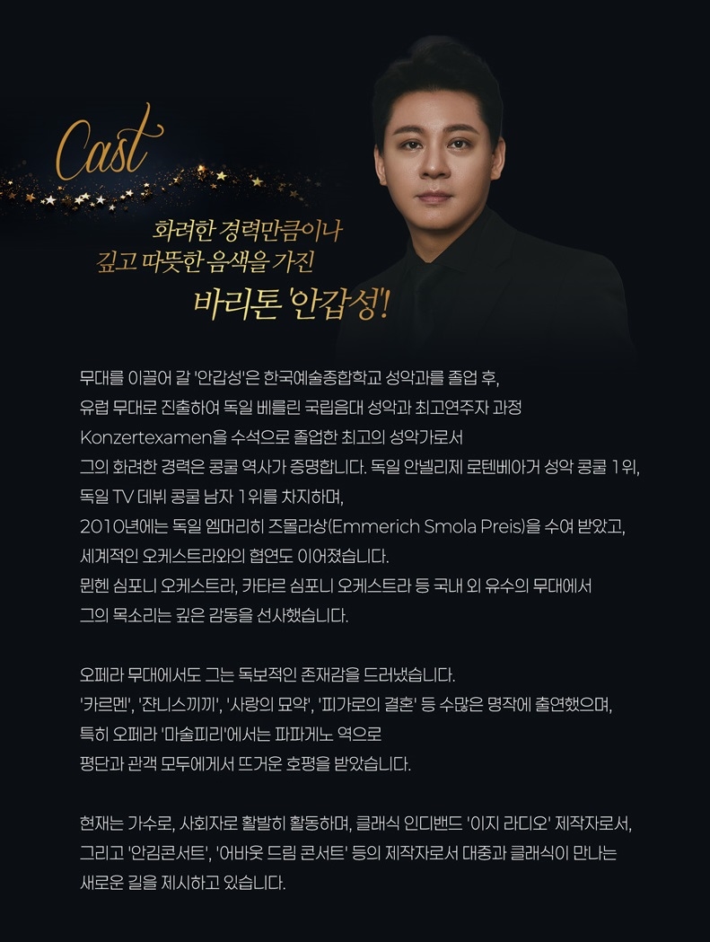 바리톤 안갑성은 깊고 따뜻한 음색으로 무대를 압도하는 최고의 성악가로, 한국예술종합학교와 독일 베를린 국립음대 최고 연주자과정을 수석으로 졸업했다. 그는 독일 안넬리제 로텐베아거 성악 콩쿠르 1위, 독일 TV 데뷔 콩쿠르 남자 1위 등 여러 권위 있는 대회에서 수상을 하며 유럽 무대에서 이미 그 역량을 인정받았다. 또한 뮌헨 심포니, 카타르 심포니 오케스트라 등 세계적인 오케스트라와의 협연을 통해 음악적 깊이를 더욱 확장해 왔다. 현재는 클래식 인디밴드 ‘이지 라디오’의 제작자이자 다양한 콘서트를 기획하며 대중과 클래식의 교감을 이끌어내고 있다.