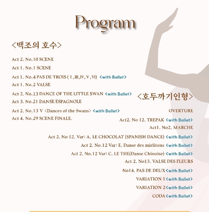 이번 공연에서는 차이콥스키 발레 음악의 양대 걸작인 ‘호두까기 인형’과 ‘백조의 호수’를 한 무대에 담아, 60인조 풀 오케스트라의 웅장한 라이브 연주와 발레의 움직임이 결합된 갈라 형식의 스페셜 무대로 펼쳐진다.